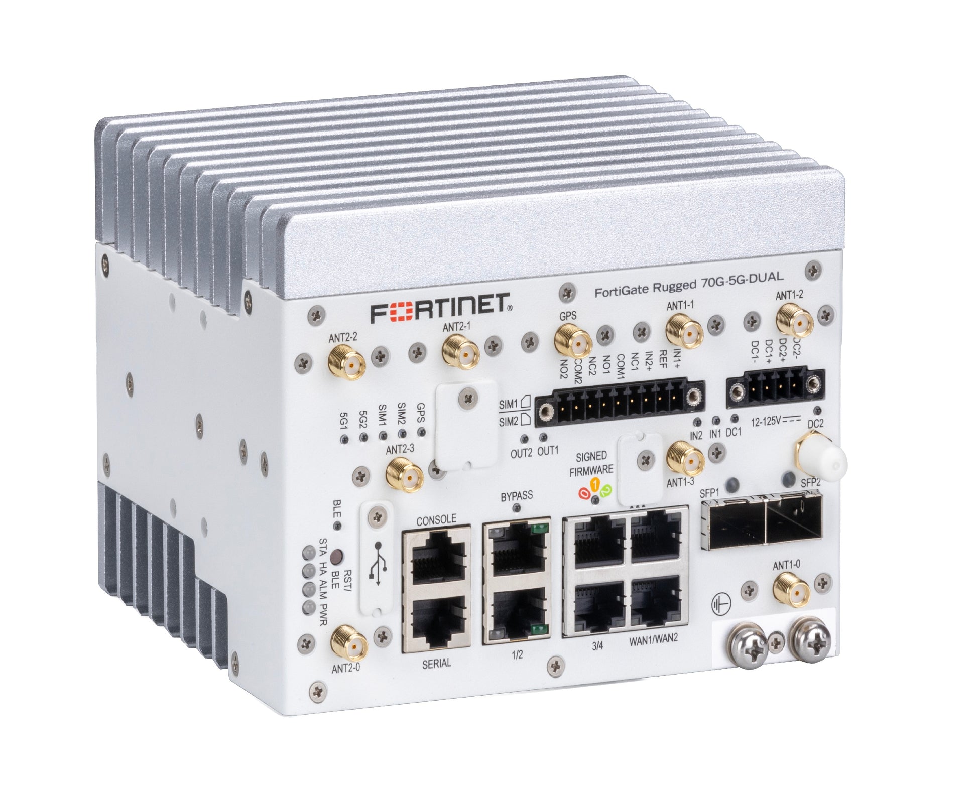 FortiGateRugged-70G-5G-DUAL Ruggedized, indoor, 6x GE RJ45 LAN ports (including 2x GE RJ45 bypass port ), 2x SFP, 1x RJ45 serial port (data), 1x RJ45 serial port (console), 1x USB port, 1x MicroSD card slot, embedded 5G wireless WAN module (includes, 2x SIM slots - Active/Active, 8x external 5G antennae), Passive GPS (includes, 1x external SMA GPS antenna), dual power inputs.